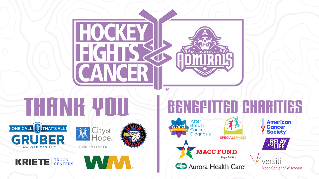 The Admirals are proud to join the entire hockey world and celebrate the Hockey Fights Cancer initiative. Hockey Fights Cancer is a league-wide effort dedicated to raising awareness and funds for cancer research and patient care. This season, teams and fans will come together to support those battling this disease and to honor the survivors who inspire us all. This special day would not be possible without the generous support of our sponsors: The City of Hope Cancer Center, Gruber Law Offices, Kriete Truck Centers, Major Goolsby’s, and WM. Thanks to these outstanding organizations, their supporting sponsorship, the evening’s 50/50 raffle, and generous fan donations will directly benefit local organizations dedicated to cutting-edge cancer research and providing vital support services to patients and their families during challenging times.